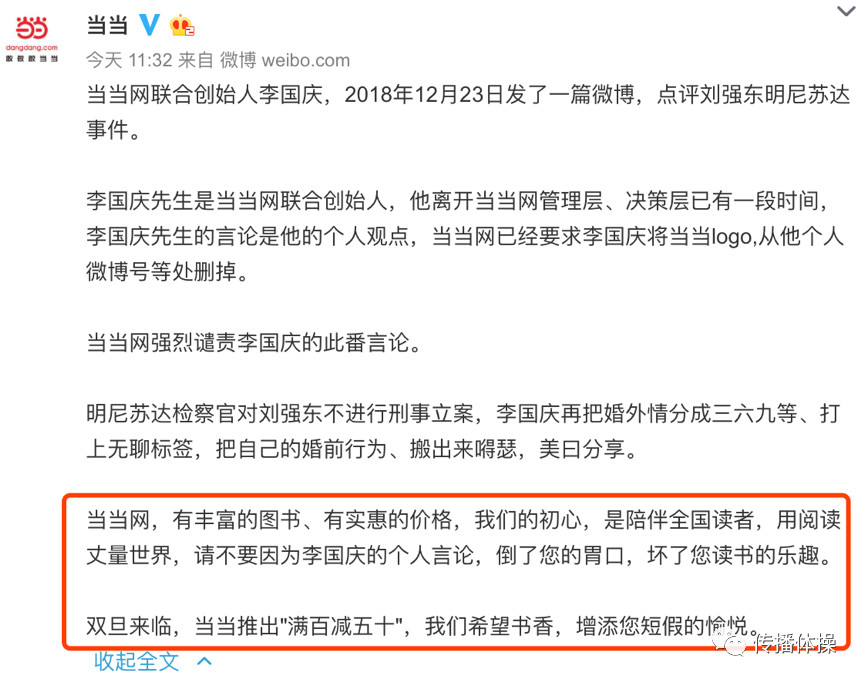 事情的高潮在于,當當網(wǎng)官方微博開始“懟”回李國慶,強烈譴責李國慶個人言論之余,還不忘給自己的平臺和雙旦活動做點宣傳。這一波猝不及防的廣告,可以說是深得“六學”的精髓了。